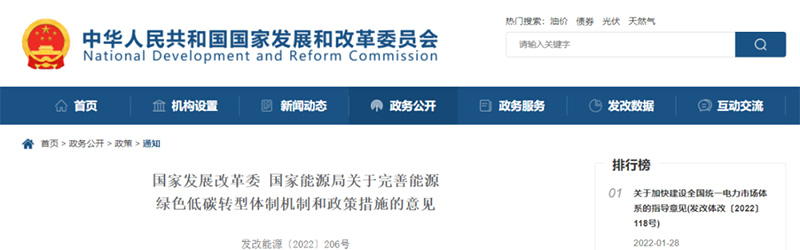 「国家发改委 国家能源局关于完善能源绿色低碳转型体制机制和政策措施的意见」发布