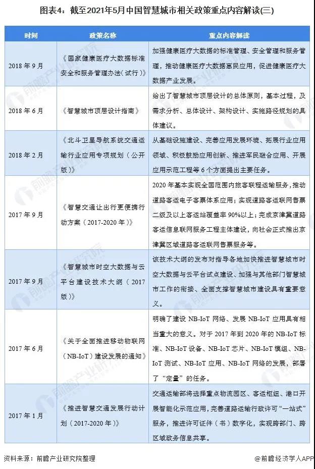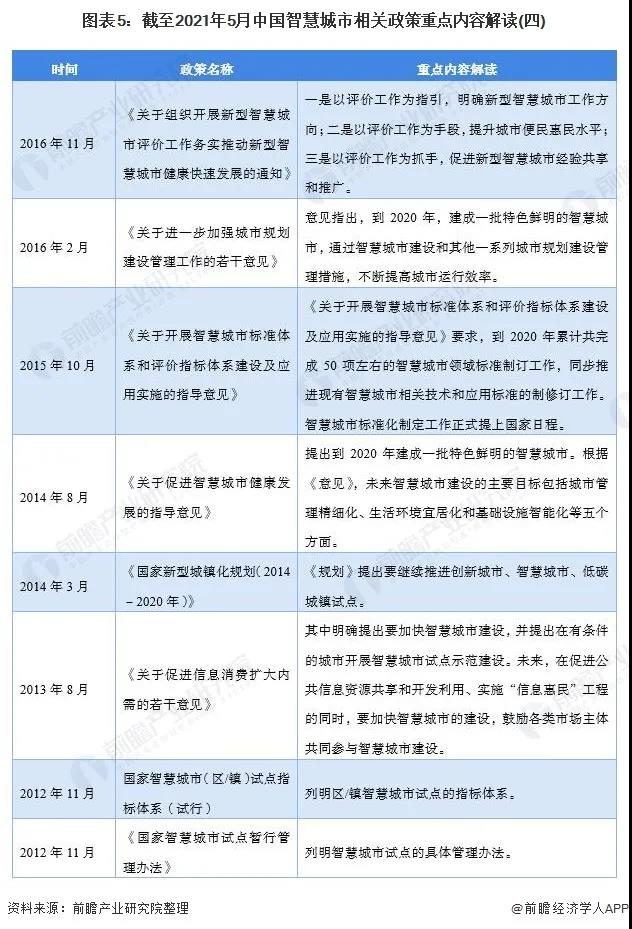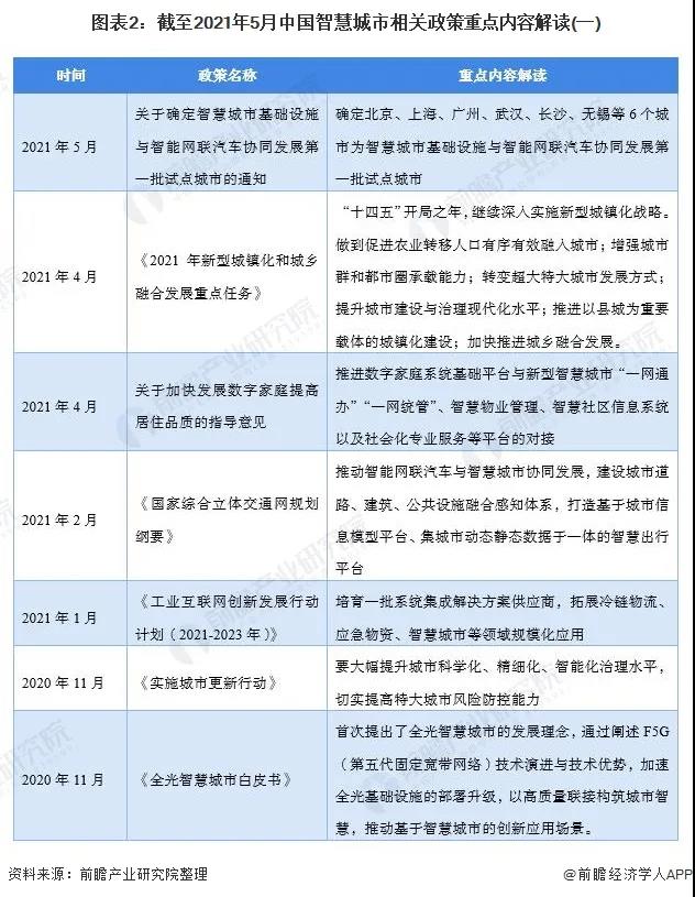 从整个政策文件中可以看出,各类文件分别从总体架构到具体应用等角度分别对智慧城市建设提出了鼓励措施,“加快”和“促进”是出现频度较高的关键词。截止2021年5月,我国智慧城市建设相关政策汇总如下: