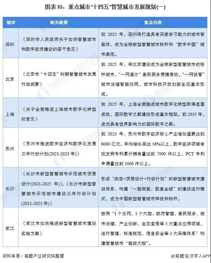 2021年,北京、上海、深圳等智慧城市领头示范城市发布了相关政策,制定了相关规划,不约而同将智慧城市写入了2021年的首要发展任务,正式拉开了“十四五”开局之年的智慧城市新篇章。例如深圳市政府在2021年1月发布《深圳市人民政府关于加快智慧城市和数字政府建设的若干意见》,提出到2025年,深圳将打造具有深度学习能力的城市智能体,成为全球新型智慧城市标杆和“数字中国”城市典范。