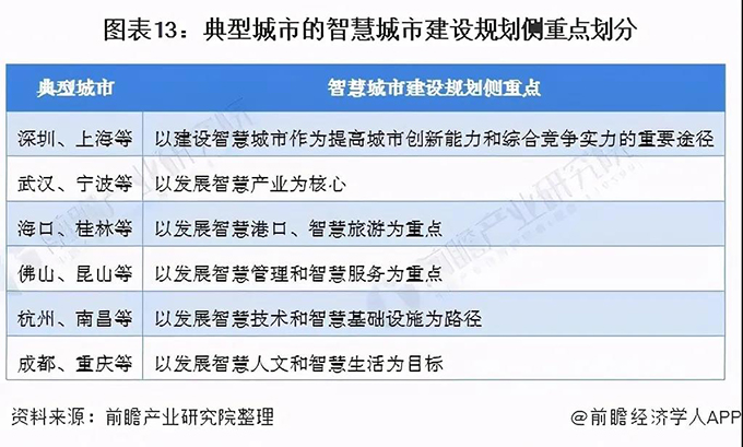 在政策的大力推动下,智慧城市的建设在一线城市和发达的二线城市已经开始进行,然而,由于城市与城市之间发展水平和信息化程度也千差万别。对于发达城市来说,会重点发展民生相关的智慧城市建设,以智慧城市提高城市创新和竞争能力;而对于中型城市,则会更注重智慧城市与当地旅游、港口等资源的结合。
